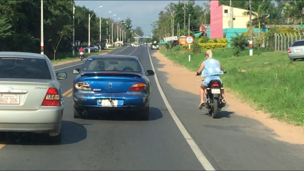 Neben einem fahrendem Auto mit offenem Fenster, fuhr eine Dame im gleichen Tempo mit ihrem Motorrad und hielt ein Sonntagsschwätzchen. Das hielt den Verkehr auf.https://paraguay-pioniere.com/wp-content/uploads/2019/07/img_3656.mov